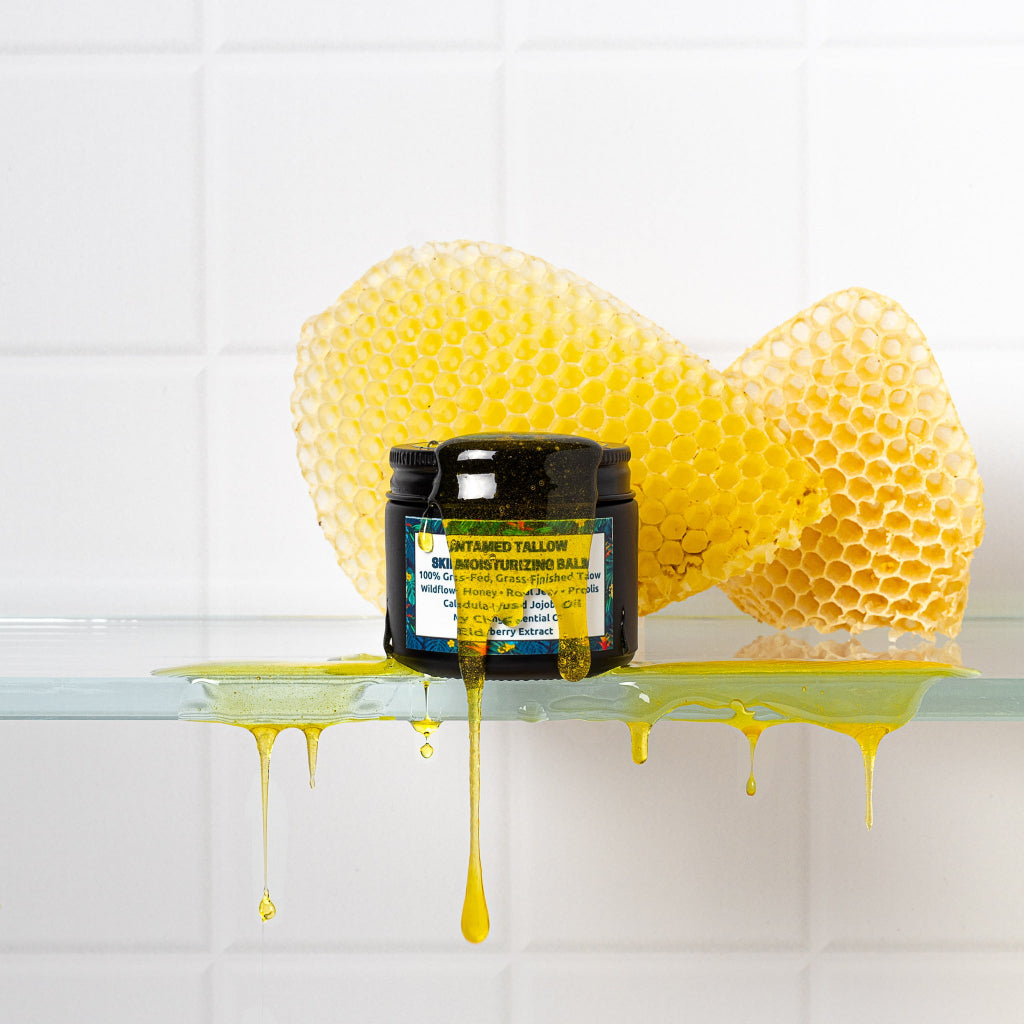 100% Grass Fed & Finished Tallow Raw Wildflower Honey, Bees Wax, Rosehip Oil, and Calendula-Infused Jojoba Oil.