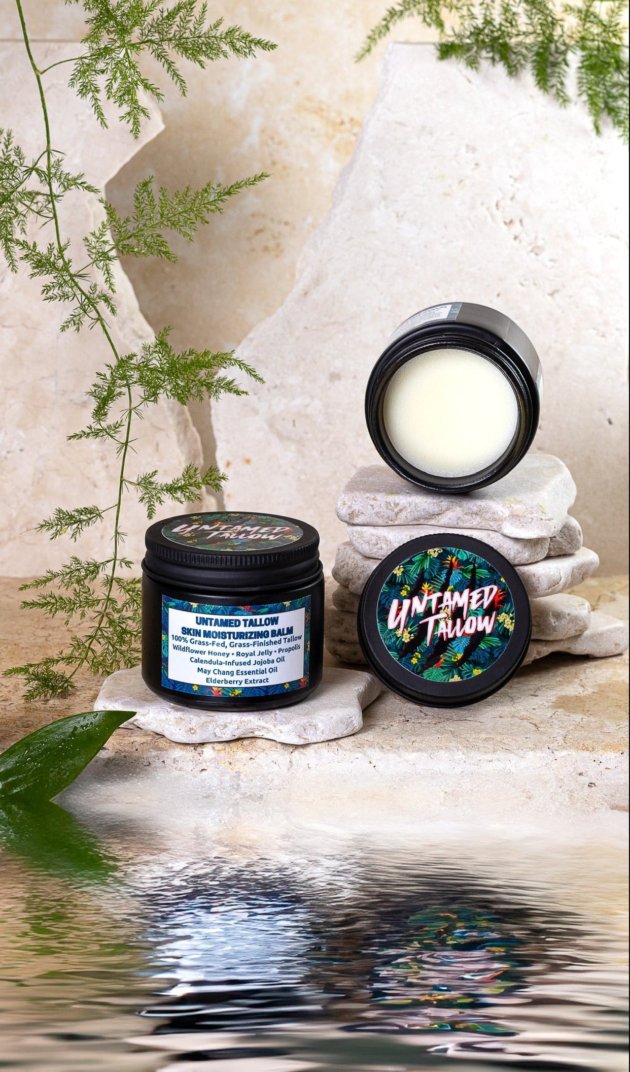Crafted with 100% grass-fed & finished beef suet tallow and infused with gentle, skin-nourishing ingredients: raw wildflower honey, royal jelly, bee propolis, jojoba oil, calendula, elderberry, and just 2 drops of essential oil per jar.